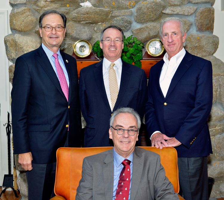 Newly elected officers (standing from left to right): Steven Hoch, chairman of the corporation; David B. Scully, chairman of the board; and Jefferson Hughes, vice chairman of the board of trustees. WHOI President and Director Mark Abbott is seated.